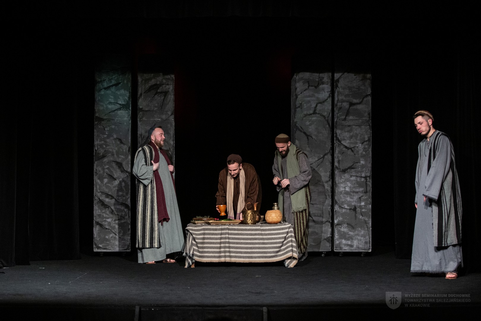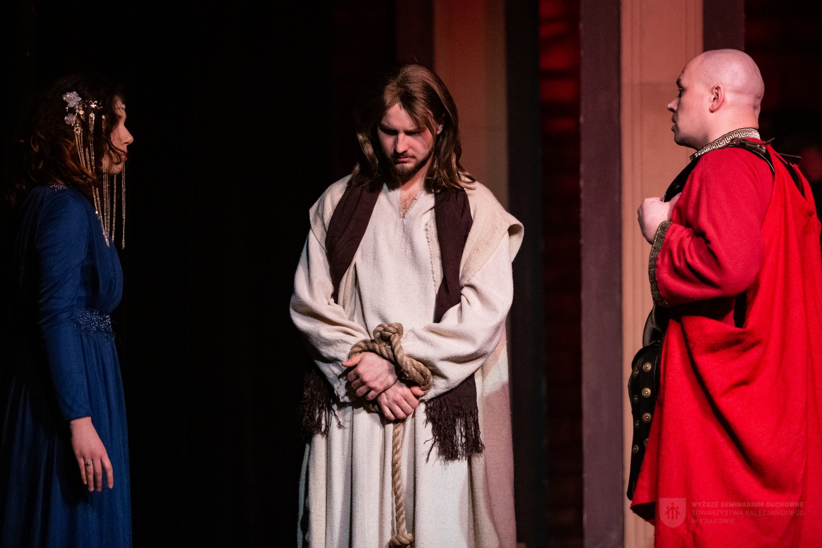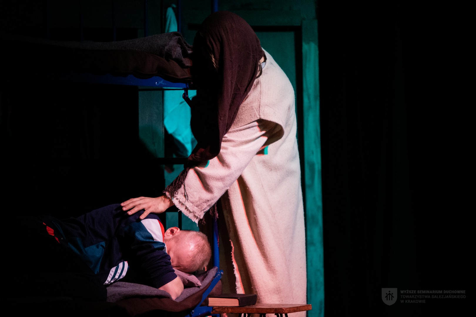 Z utęsknieniem czekałam, by w sobotę, 1.04.br. wraz ze starszymi mariankami móc pojechać do Krakowa i zobaczyć kolejne już salezjańskie Misterium w reżyserii Marcina Kobierskiego oraz w wykonaniu salezjańskich kleryków i wspólnoty Ziemi Boga. To niezwykłe Misterium jest dla mnie ogromną łaską, takim świętym czasem rekolekcji. Reżyser podchodzi do tematu Męki Pańskiej w zupełnie niekonwencjonalny sposób. W tym roku posłużył się historią życia Grzegorza Czerwickiego, która zderza się z Męką Chrystusa i z dobrym łotrem. Do stworzenia scenariusza Misterium posłużyła udostępniona przez autora historia życia opisana w książce "Nie jesteś skazany". Grzegorz przez dobrych kilka lat siedział w więzieniu, miał totalnie rozwalone życie i raczej był daleko od Boga, dopóki Bóg nie zainterweniował i Jezus stał się jego najlepszym Przyjacielem. Lustrzanym odbiciem dla Grześka jest postać Dyzmy, dobrego łotra. Odczytuję to jako kolejną szansę na nawrócenie. Ciekawa jest scena, kiedy Dyzma spotyka Judasza i dopytuje go o przypowieść o zagubionej owcy, bo właściwie obydwoje byli takimi zagubionymi owcami. Niestety, Judasz nie pojmuje, że „w niebie większa będzie radość z jednego grzesznika, który się nawraca, niż z dziewięćdziesięciu dziewięciu sprawiedliwych, którzy nie potrzebują nawrócenia”. Każda ze scen wiele wnosi w moje życie. Interesująca jest postać żony Piotra, która zmaga się z odejściem Szymona Piotra, gdy inni szemrzą, że jest opuszczona, widzimy też jej reakcje na uzdrowienie matki… Rewelacyjnie jest pokazany sen Klaudii o Jezusie, jej relacje z Piłatem i wzajemne cytowanie sobie Seneki.